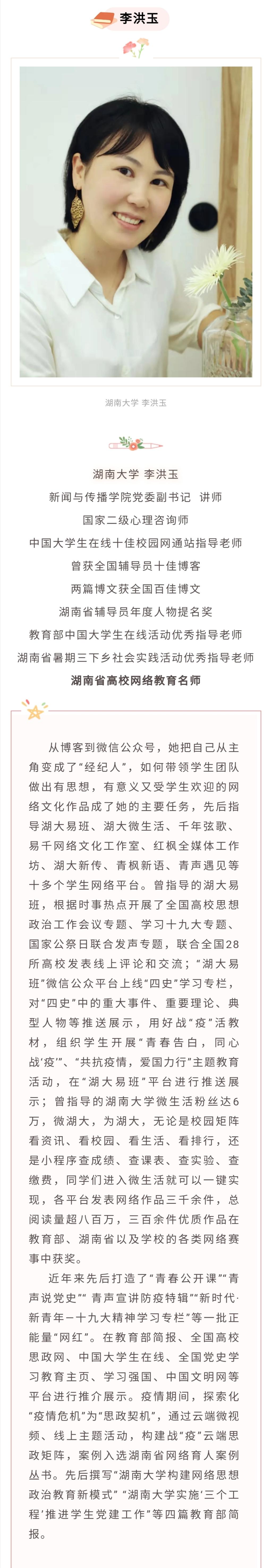 上一条:张杜豆:湖南师范大学工程与设计学院专职辅导员、中国大学生在线“小中视觉工作室”指导老师、第二批“湖南省高校网络教育名师培育支持计划”入选者