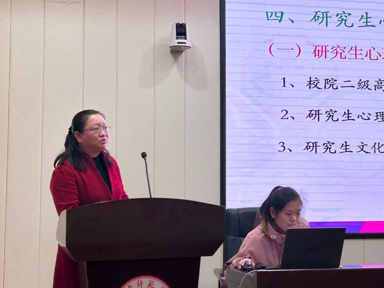 龚勋进行专题讲座。她从案例分析的角度切入,对研究生心理健康教育管理的工作体系作出分析。针对研究生的心理健康问题,她指出,应锁定重点群体,开展心理危机和日常教育管理的排查,建立好一级心理危机预警管理库,形成“早发现、早报告、早研制、早预防、早控制”的应对机制。