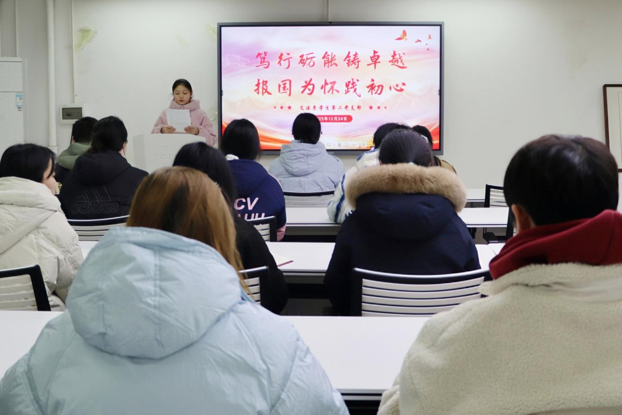 (通讯员 周李羽檬 席琴 吴思桥)12月24日下午,我院文法系学生第二党支部在党员之家召开以“笃行砺能铸卓越,报国为怀践初心”为主题的研讨交流会。文法系学生第二党支部书记彭娇出席会议。会议由文法系学生第二党支部成员吴思桥主持。