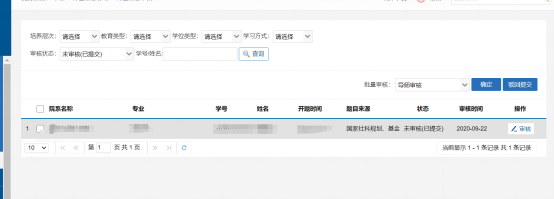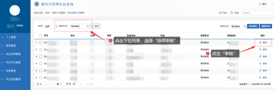 第一步:点击页面左上角“审核状态”旁的下拉菜单,选择“导师审核”,点击查询,会出现导师审核通过的学生名单;