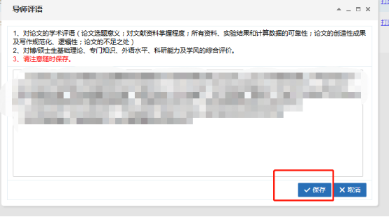 2填写学术评语:在单个学生论文记录后面点击“填写”,填写完毕后点击“保存”,请注意随时保存(系统半分钟自动保存一次)。