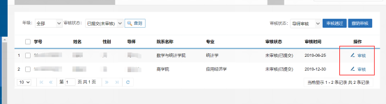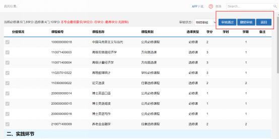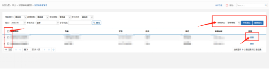 2审核方式:分批量审核和单个学生审核,审核操作同2.1培养计划审核,审核界面如下: