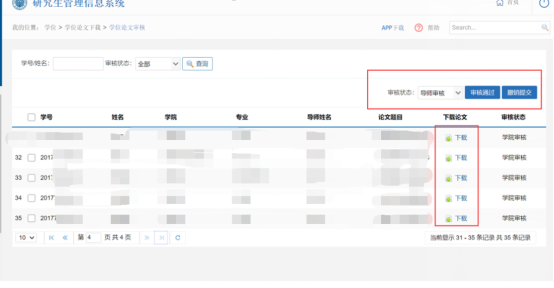 进入审核界面后,点击“下载”,可以查看下载的学生论文,如果同意定稿,则在学号前的方框中点击勾选,在“审核状态”中选择“导师审核”,然后点击“审核通过”即可。
