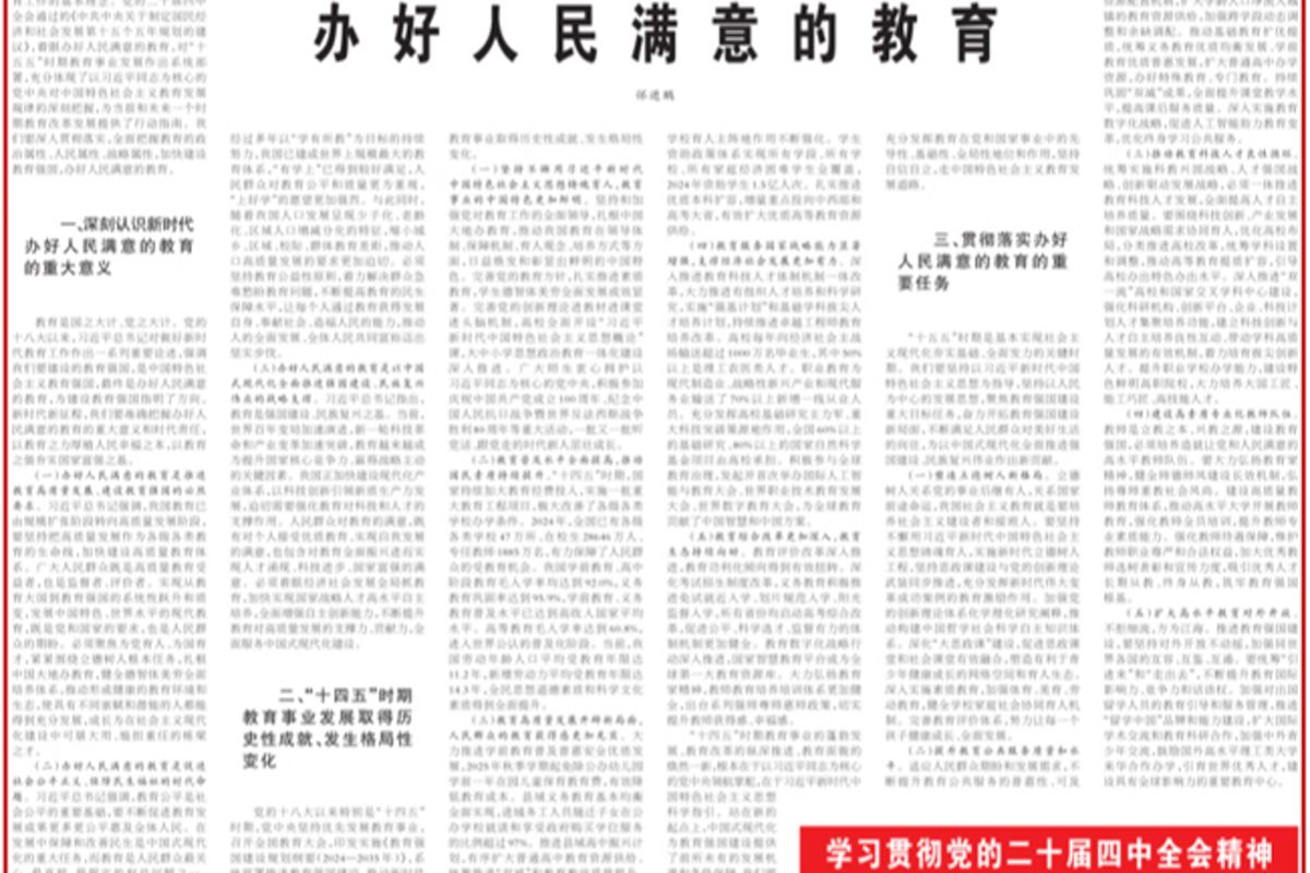 全心全意为人民服务是党的根本宗旨,坚持以人民为中心发展教育是教育工作的基本理念。党的二十届四中全会通过的《中共中央关于制定国民经济和社会发展第十五个五年规划的建议》,着眼办好人民满意的教育,对“十五五”时期教育事业发展作出系统部署,充分体现了以习近平同志为核心的党中央对中国特色社会主义教育发展规律的深刻把握,为当前和未来一个时期教育改革发展提供了行动指南。我们要深入贯彻落实,全面把握教育的政治属性、人民属性、战略属性,加快建设教育强国,办好人民满意的教育。
